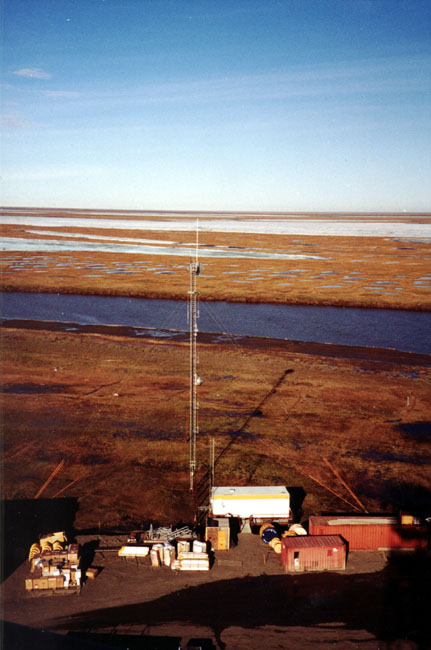 Temporary comm tower seen from new permanent comm tower June 2000, Alpine Pad, North Slope / Coleville River Delta, Alaska